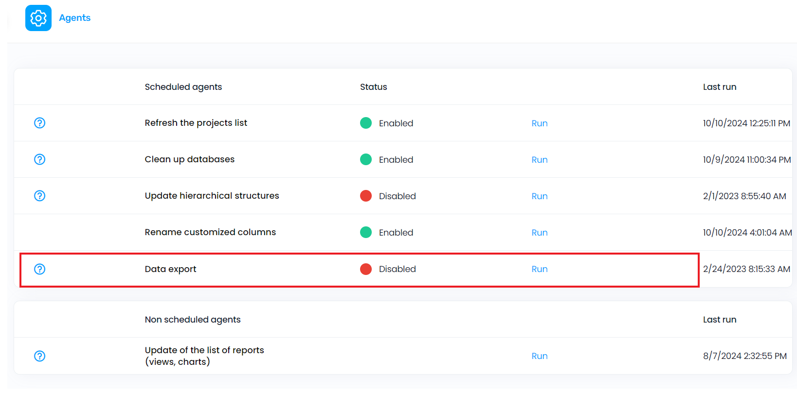 To run the export as defined in the setup, the Export Agent must be enabled.