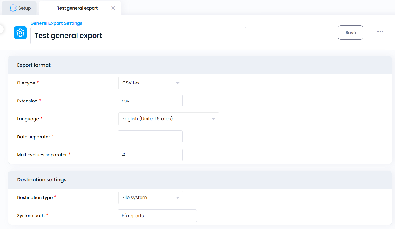 Select the flat view to export. The export will include all columns in the selected view. Fill in the previously defined general export settings to specify the destination.