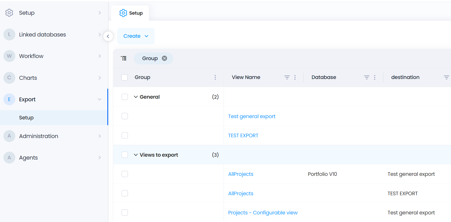 Define the view to export. Use the "Create" menu to set up a view for export.